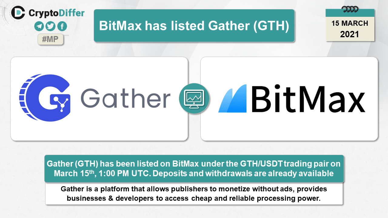 Gather (GTH) has been listed on BitMax under the GTH/USDT trading pair on March 15th, 1:00 PM UTC. Deposits and withdrawals are already available.