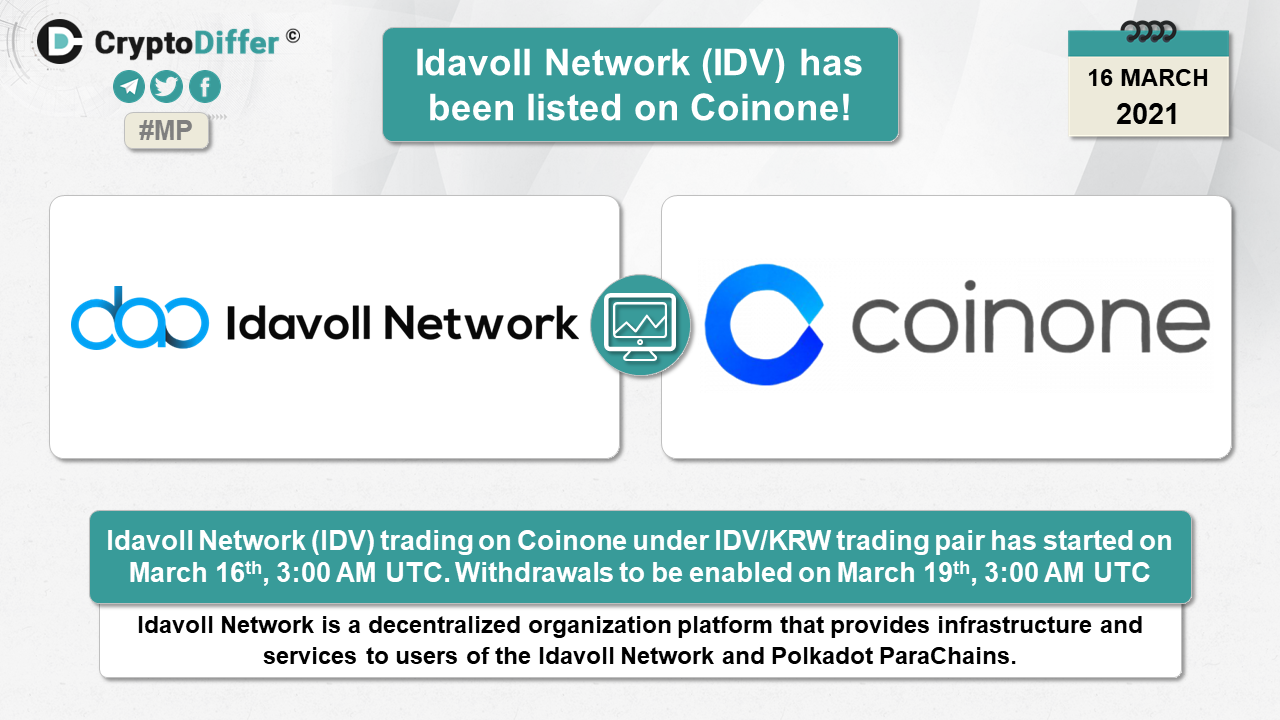 Idavoll Network (IDV) trading on Coinone under IDV/KRW trading pair has started on March 16th, 3:00 AM UTC. Withdrawals to be enabled on March 19th, 3:00 AM UTC.