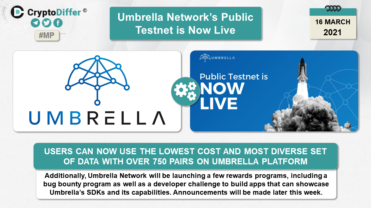 Users can now use the lowest cost and most diverse set of data with over 750 pairs on Umbrella platform. Additionally, Umbrella Network will be launching a few rewards programs, including a bug bounty program as well as a developer challenge to build apps that can showcase Umbrellaβs SDKs and its capabilities.