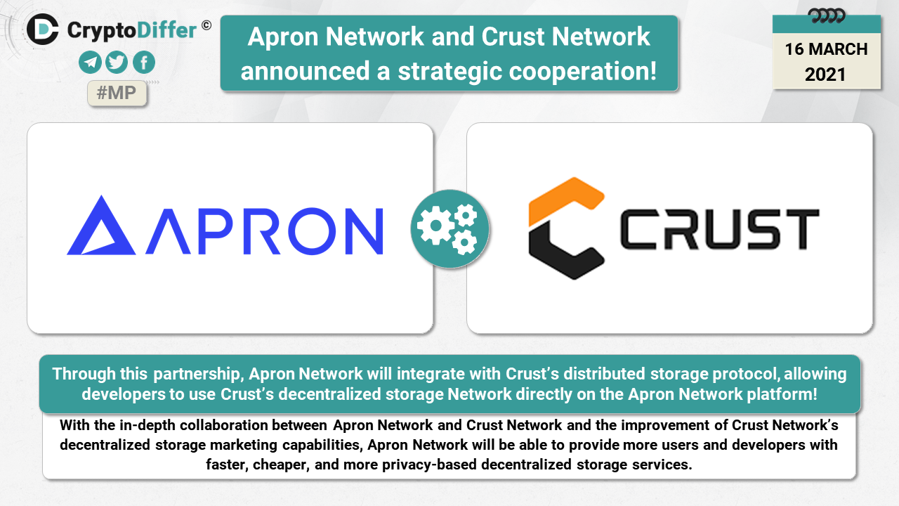 Through this partnership, Apron Network will integrate with Crustβs distributed storage protocol, allowing developers to use Crustβs decentralized storage Network directly on the Apron Network platform.