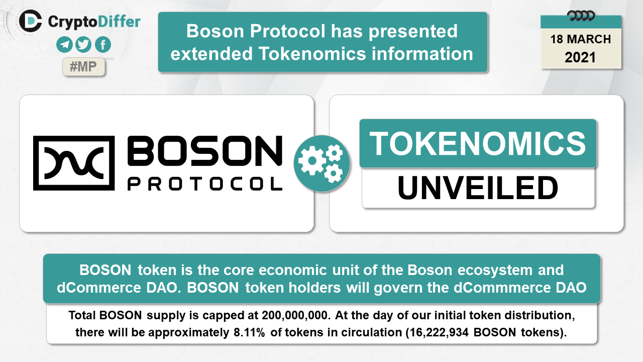 BOSON token is the core economic unit of the Boson ecosystem and dCommerce DAO. BOSON token holders will govern the dCommmerce DAO. Total BOSON supply is capped at 200,000,000. At the day of our initial token distribution, there will be approximately 8.11% of tokens in circulation (16,222,934 BOSON tokens).