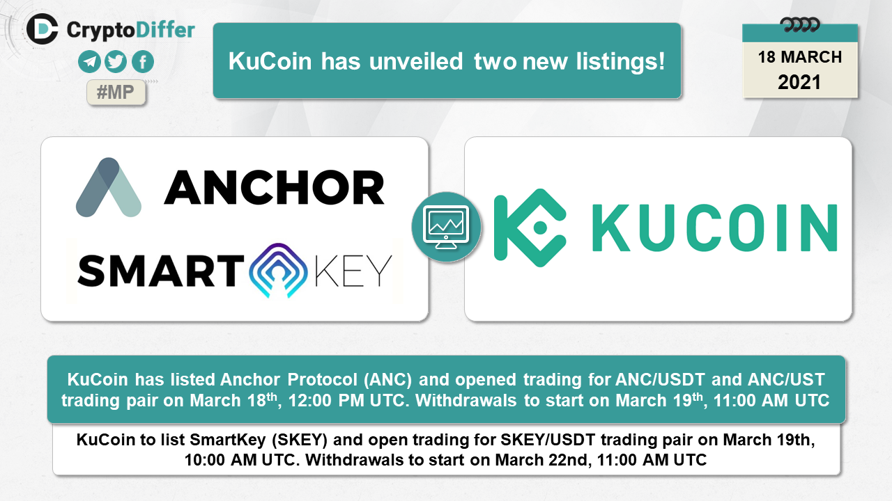 KuCoin has listed Anchor Protocol (ANC) and opened trading for ANC/USDT and ANC/UST trading pair on March 18th, 12:00 PM UTC. Withdrawals to start on March 19th, 11:00 AM UTC.
