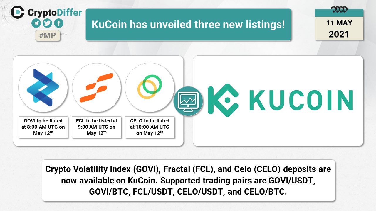 Crypto Volatility Index (GOVI), Fractal (FCL), and Celo (CELO) deposits are now available on KuCoin. Supported trading pairs are GOVI/USDT, GOVI/BTC, FCL/USDT, CELO/USDT, and CELO/BTC.