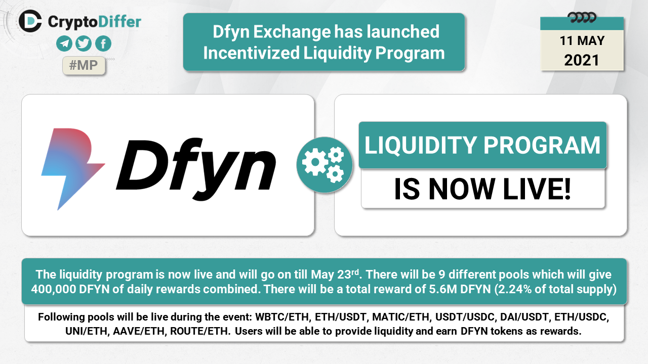 The liquidity program is now live and will go on till May 23rd. There will be 9 different pools which will give 400,000 DFYN of daily rewards combined. There will be a total reward of 5.6M DFYN (2.24% of total supply).