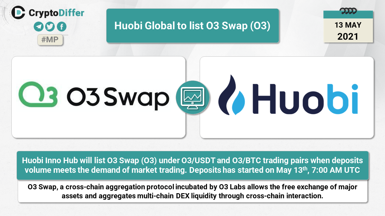 Huobi Inno Hub will list O3 Swap (O3) under O3/USDT and O3/BTC trading pairs when deposits volume meets the demand of market trading. Deposits has started on May 13th, 7:00 AM UTC.