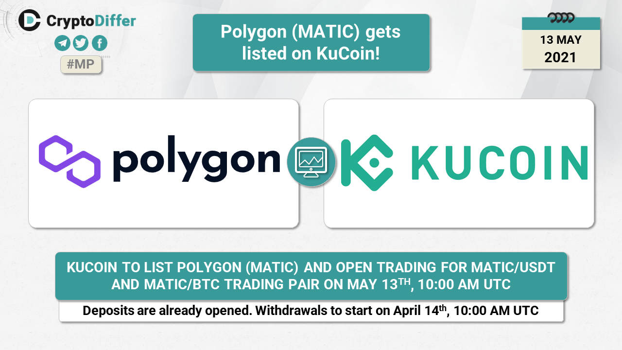 KuCoin to list Polygon (MATIC) and open trading for MATIC/USDT and MATIC/BTC trading pair on May 13th, 10:00 AM UTC.