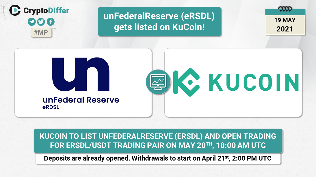 KuCoin to list unFederalReserve (eRSDL) and open trading for eRSDL/USDT trading pair on May 20th, 10:00 AM UTC.