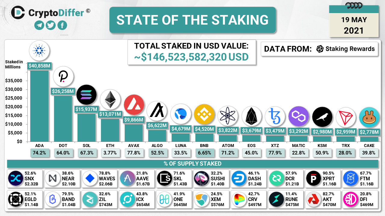 According to the Staking Rewards USD value locked in staking is around 146.5 billion USD, while the Staking Market Cap (valuation of all projects that have staking mechanism) is currently at 636 billion USD.