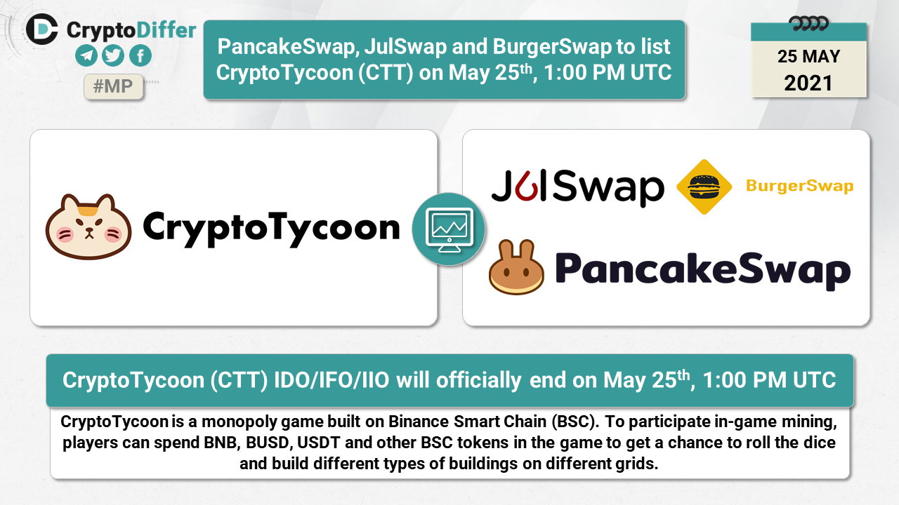 PancakeSwap, JulSwap and BurgerSwap to list CryptoTycoon (CTT) on May 25th, 1:00 PM UTC
