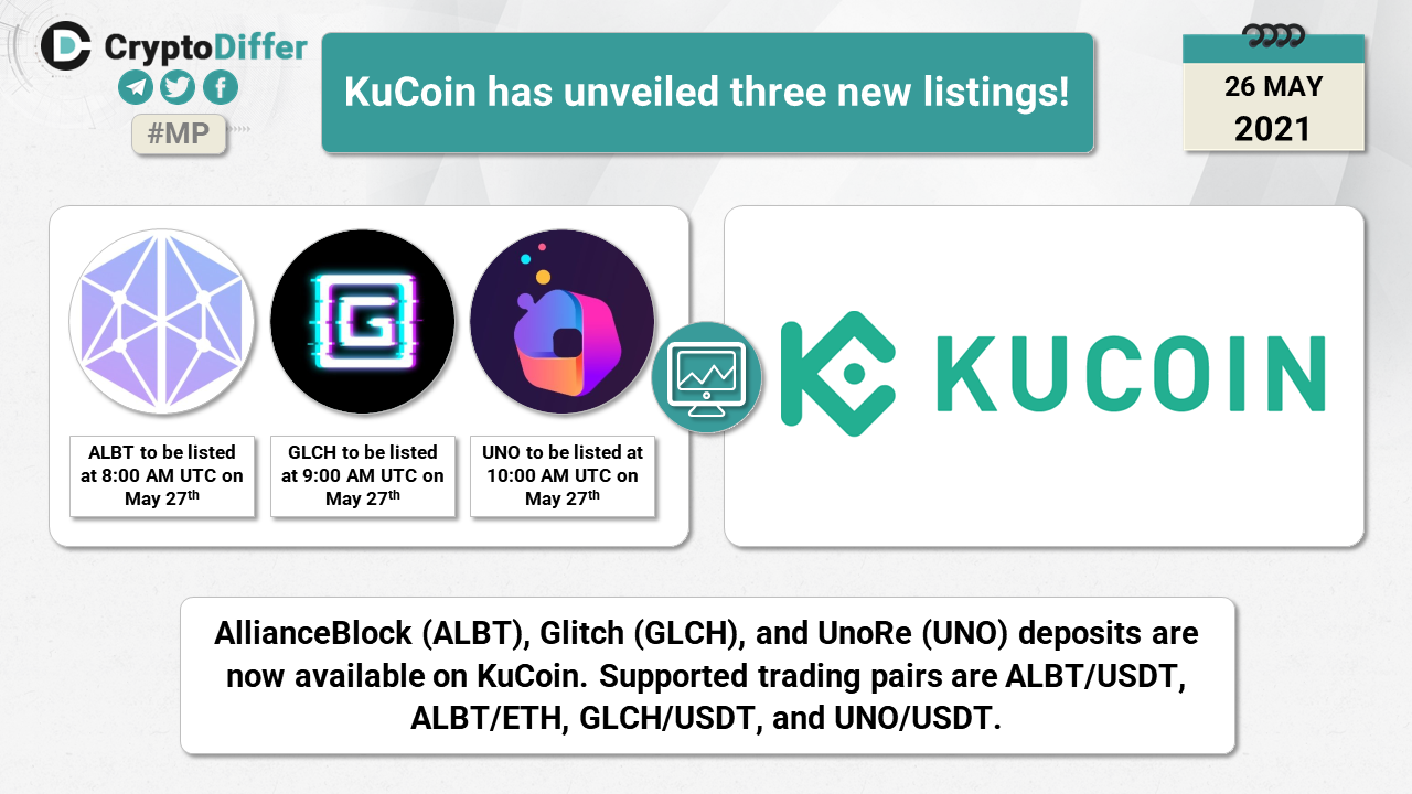 AllianceBlock (ALBT), Glitch (GLCH), and UnoRe (UNO) deposits are now available on KuCoin. Supported trading pairs are ALBT/USDT, ALBT/ETH, GLCH/USDT, and UNO/USDT.