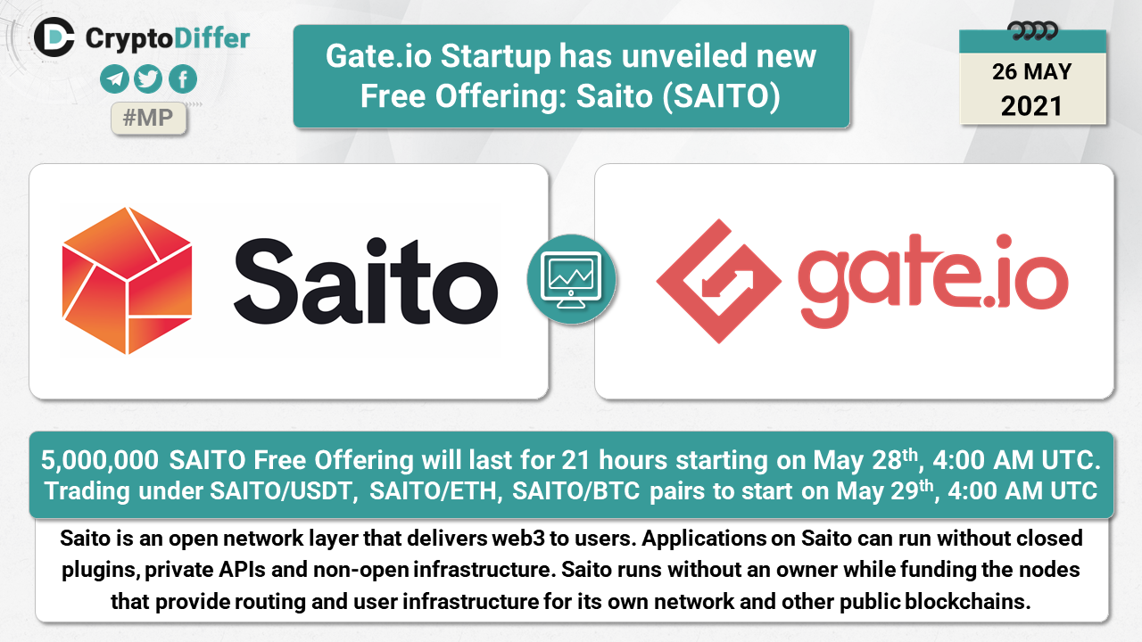 5,000,000 SAITO Free Offering will last for 21 hours starting on May 28th, 4:00 AM UTC. Trading under SAITO/USDT, SAITO/ETH, SAITO/BTC pairs to start on May 29th, 4:00 AM UTC.