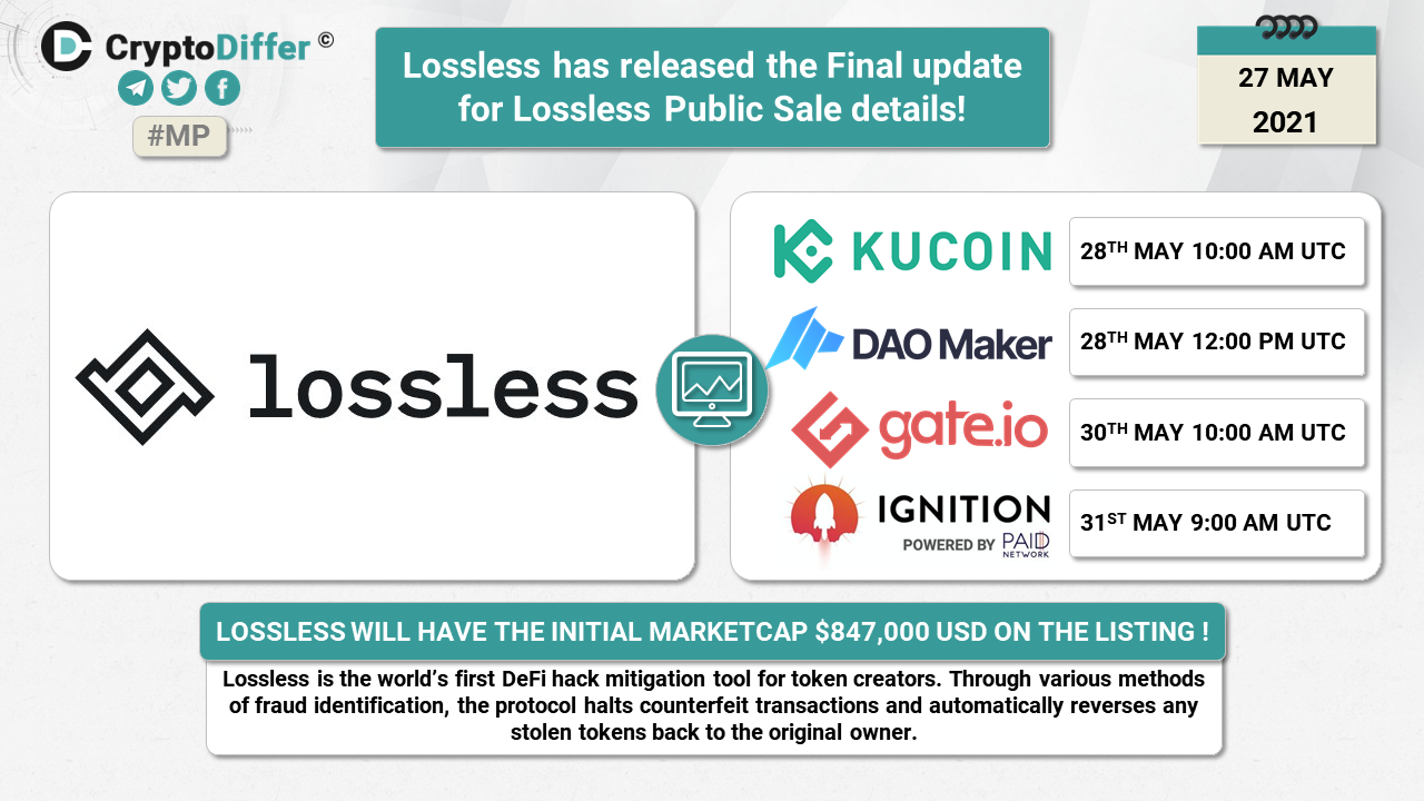 The public sale will be conducted via Kucoin BurningDrop, DAO Maker SHO, Gate Startup Initial Offering & PAID Ignition IDO. Lossless will have the initial marketcap $847,000 USD on the listing !