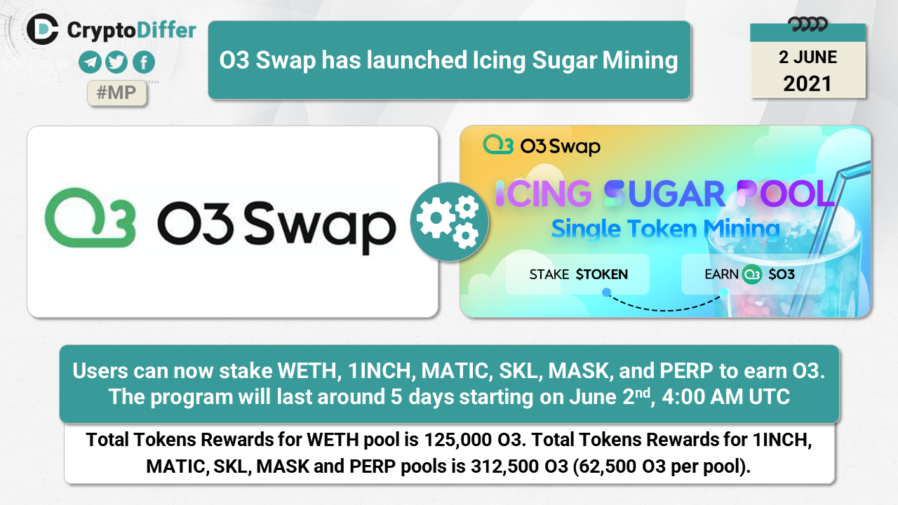 Users can now stake WETH, 1INCH, MATIC, SKL, MASK, and PERP to earn O3. The program will last around 5 days starting on June 2nd, 4:00 AM UTC.