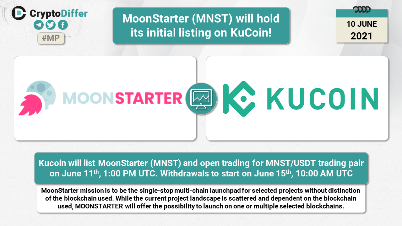 Kucoin will list MoonStarter (MNST) and open trading for MNST/USDT trading pair on June 11th, 1:00 PM UTC. Withdrawals to start on June 15th, 10:00 AM UTC.