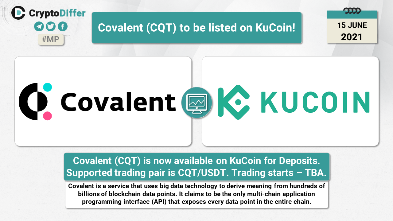 Covalent is now available on KuCoin for Deposits. Supported trading pair is CQT/USDT. Trading starts – TBA.