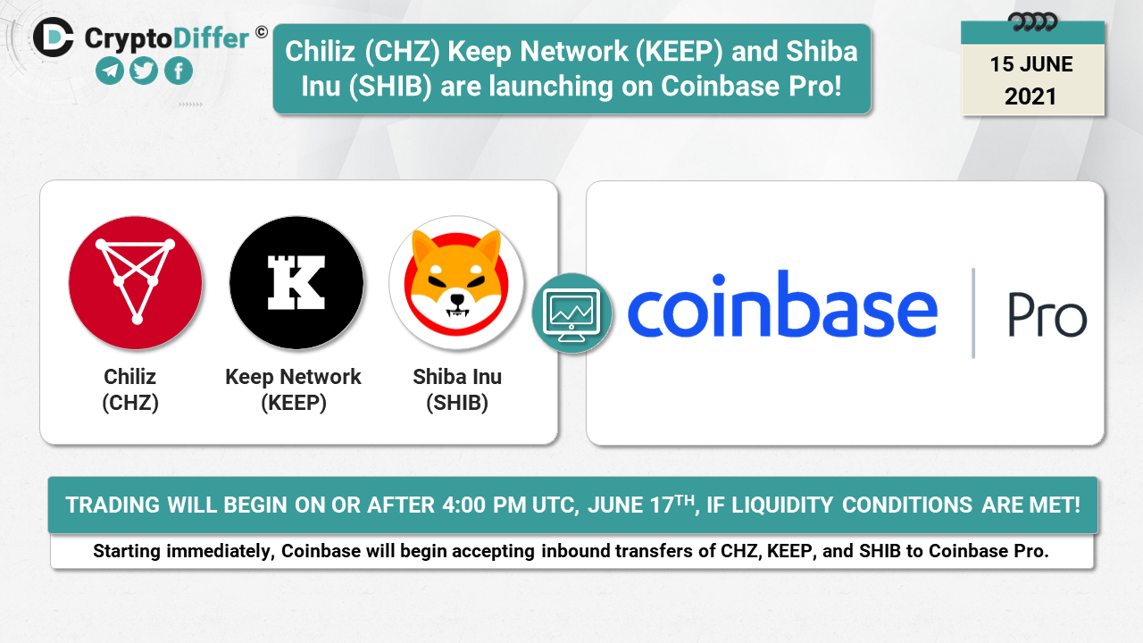 Starting immediately, Coinbase will begin accepting inbound transfers of CHZ, KEEP, and SHIB to Coinbase Pro. Trading will begin on or after 4:00 PM UTC, June 17th, if liquidity conditions are met!