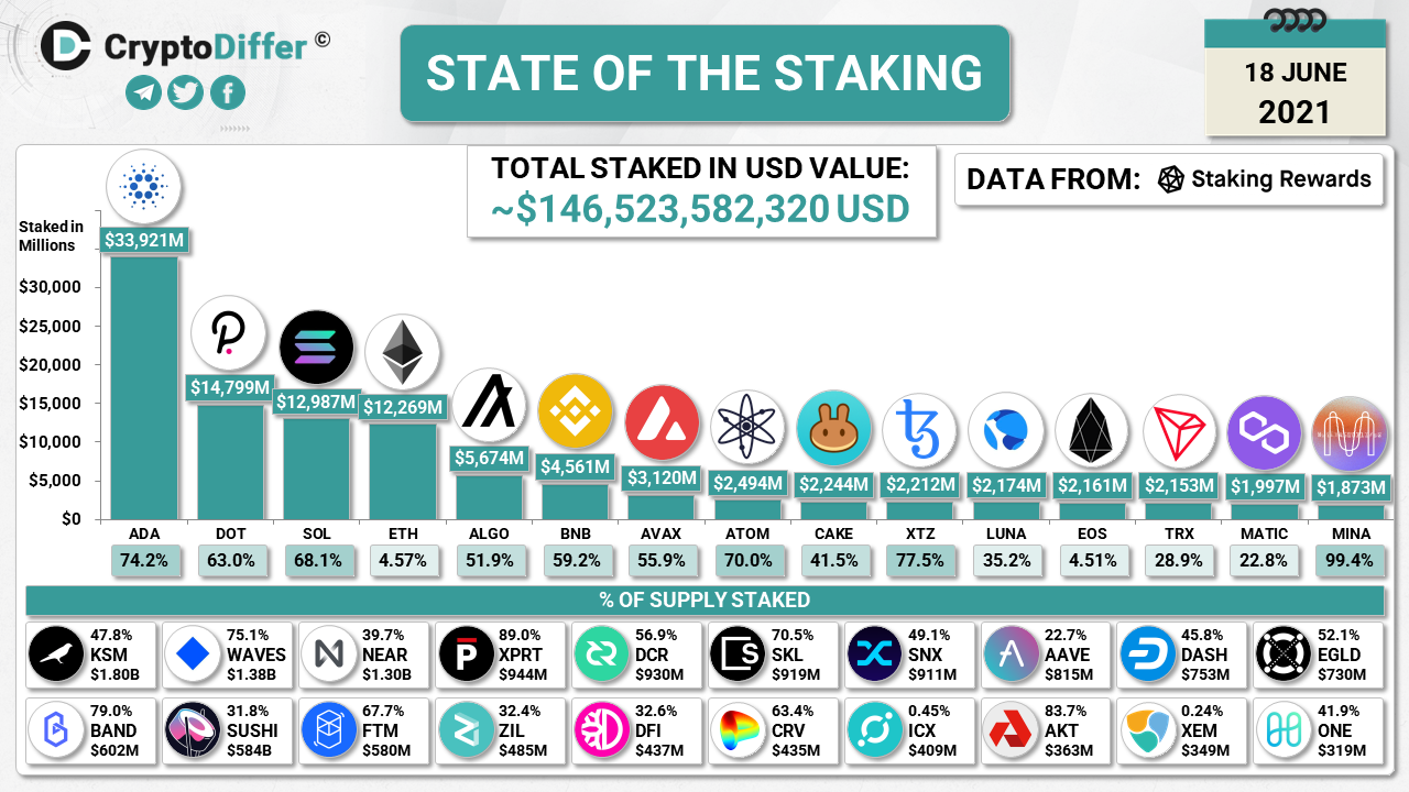 We have prepared the list of projects sorted by the USD value of the staked tokens. According to the list, top 5: Cardano, Polkadot, Solana, Ethereum, and Algorand.