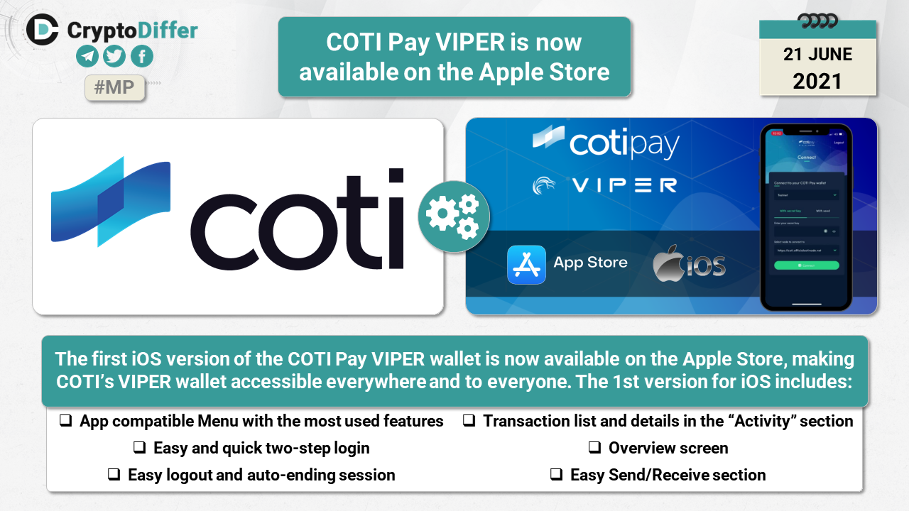 The first iOS version of the COTI Pay VIPER wallet is now available on the Apple Store, making COTIβs VIPER wallet accessible everywhere and to everyone.