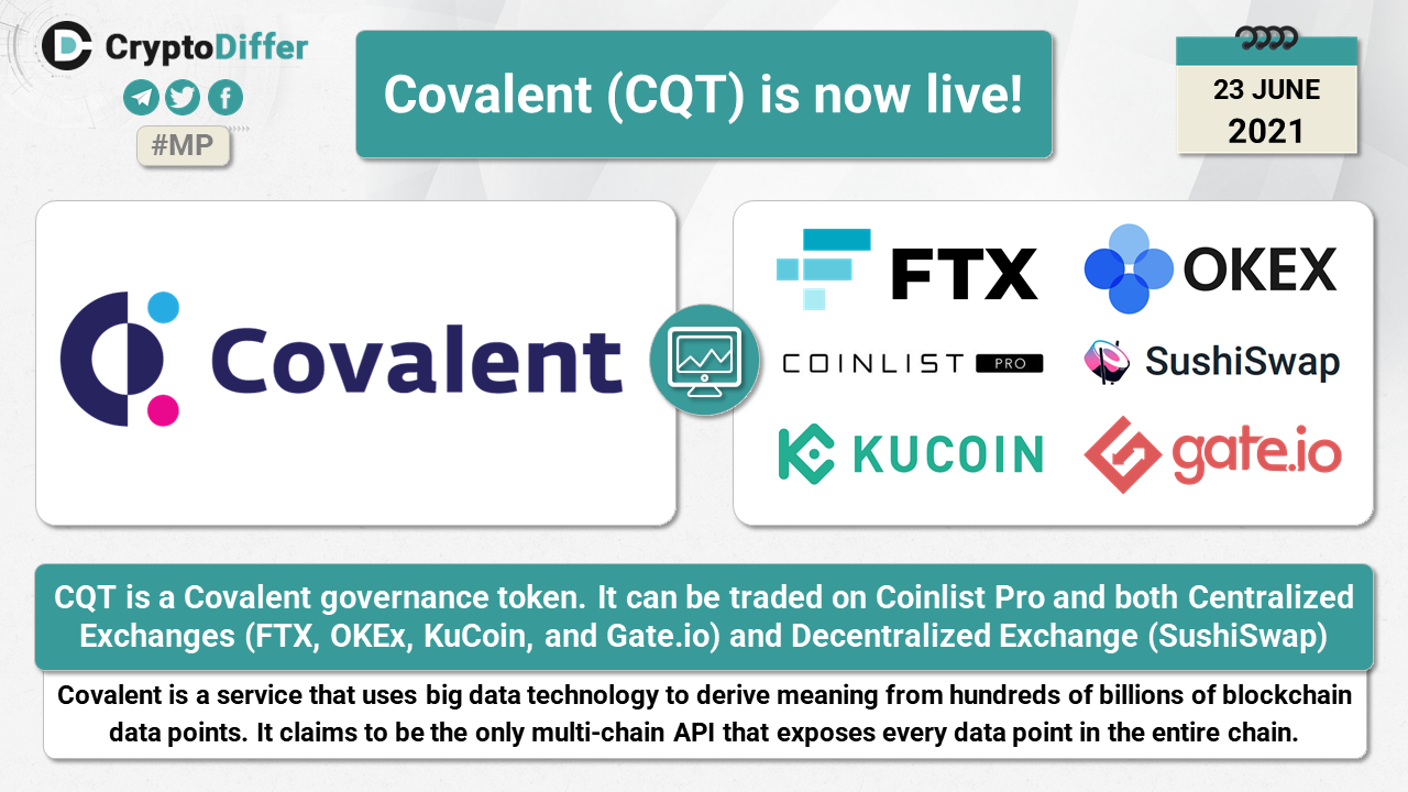 CQT is a Covalent governance token. It can be traded on Coinlist Pro and both Centralized Exchanges (FTX, OKEx, KuCoin, and Gate) and Decentralized Exchange (SushiSwap).