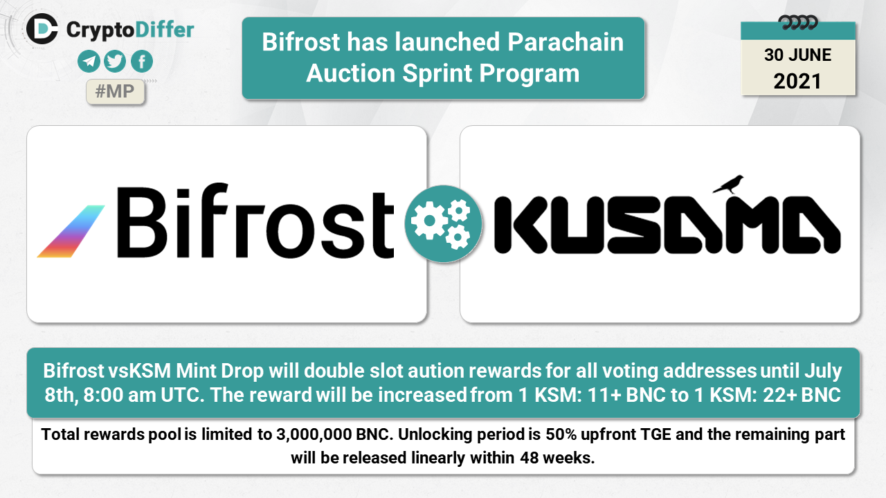 Bifrost vsKSM Mint Drop will double slot aution rewards for all voting addresses until July 8th, 8:00 am UTC. The reward will be increased from 1 KSM: 11+ BNC to 1 KSM: 22+ BNC. Total rewards pool is limited to 3,000,000 BNC.