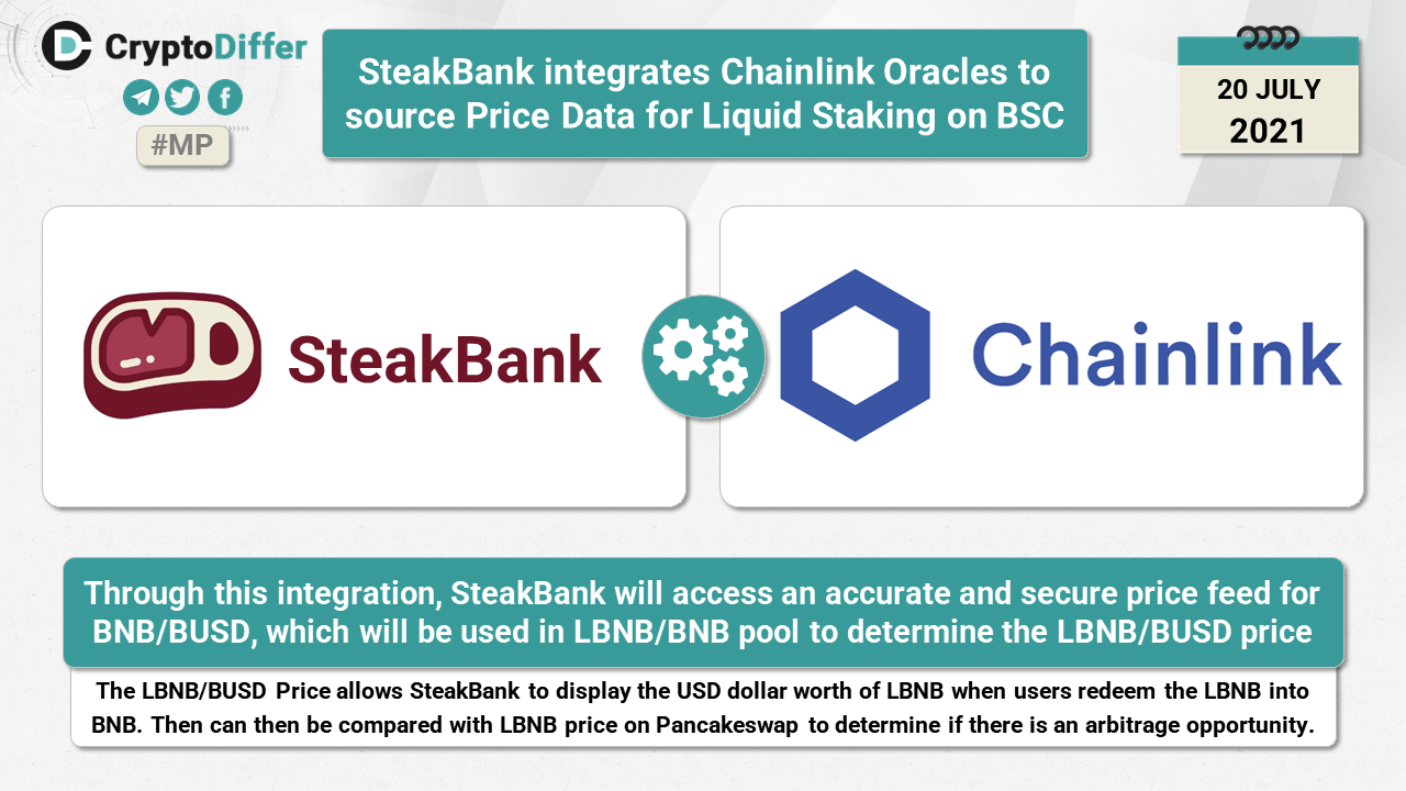 Through this integration, SteakBank will access an accurate and secure price feed for BNB/BUSD, which will be used in LBNB/BNB pool to determine the LBNB/BUSD price.