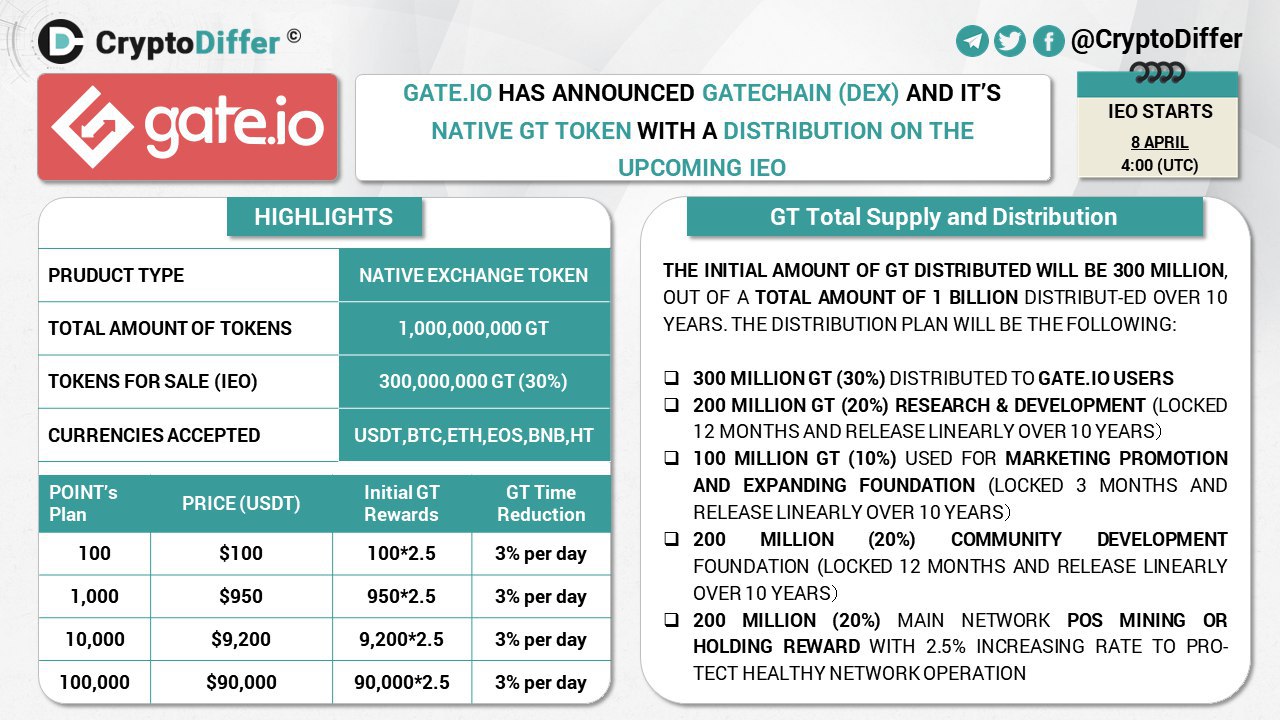 ββGate.io has announced GateChain (DEX) and itβs native GT token with a distribution on the upcoming IEO on 8th of April at 4:00 (UTC)