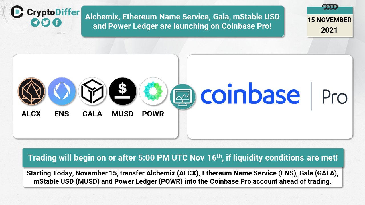 Starting Today, Monday November 15, transfer ALCX, ENS, GALA, MUSD and POWR into the Coinbase Pro account ahead of trading. Trading will begin on or after 5 PM UTC November 16, if liquidity conditions are met.