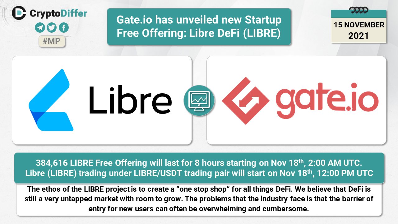 384,616 LIBRE Free Offering will last for 8 hours starting on Nov 18th, 2:00 AM UTC. Libre (LIBRE) trading under LIBRE/USDT trading pair will start on Nov 18th, 12:00 PM UTC.
