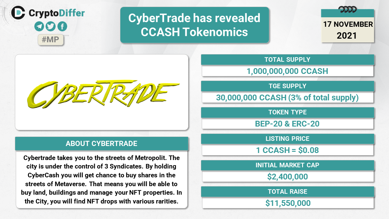 CyberTrade token total supply is 1B CCASH. Listing Price is 1 CCASH = $0.08. Initial Market Cap is $2,400,000.