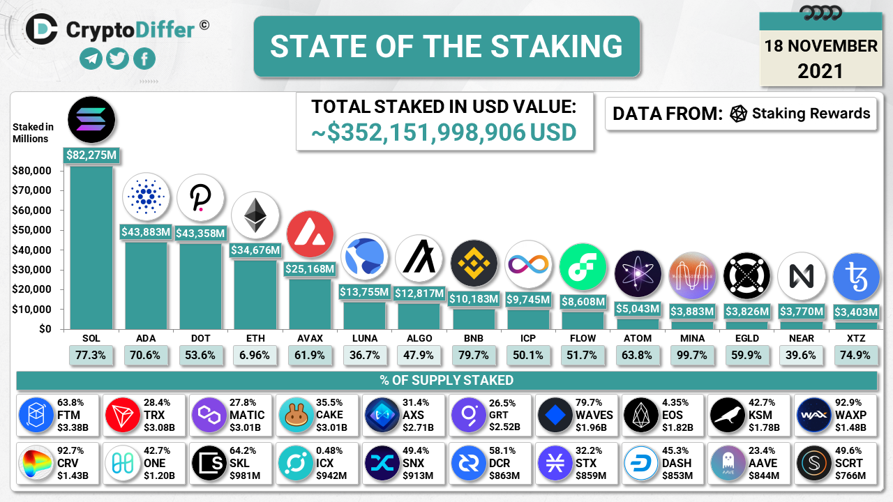 We have prepared the list of projects sorted by the USD value of the staked tokens. According to the list, top 5: Solana, Cardano, Polkadot, Ethereum, and Avalanche.