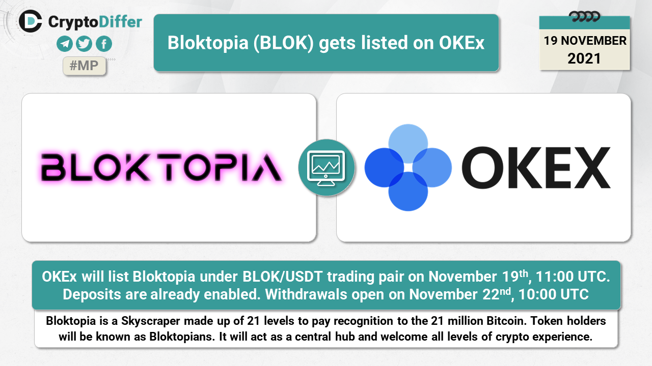 OKEx will list Bloktopia under BLOK/USDT trading pair on November 19th, 11:00 UTC. Deposits are already enabled. Withdrawals open on November 22nd, 10:00 UTC.