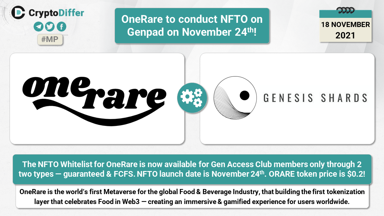 The NFTO Whitelist for OneRare is now available for Gen Access Club members only through 2 two types β guaranteed & FCFS. NFTO launch date is November 24th. ORARE token price is $0.2.