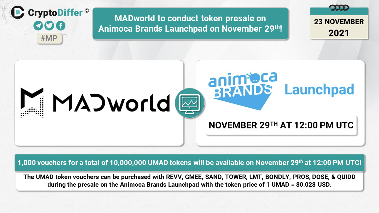 The UMAD token vouchers can be purchased with REVV, GMEE, SAND, TOWER, LMT, BONDLY, PROS, DOSE, & QUIDD during the presale on the Animoca Brands Launchpad with the token price of 1 UMAD = $0.028 USD. 1,000 vouchers for a total of 10,000,000 UMAD tokens will be available on November 29th at 12:00 PM UTC!