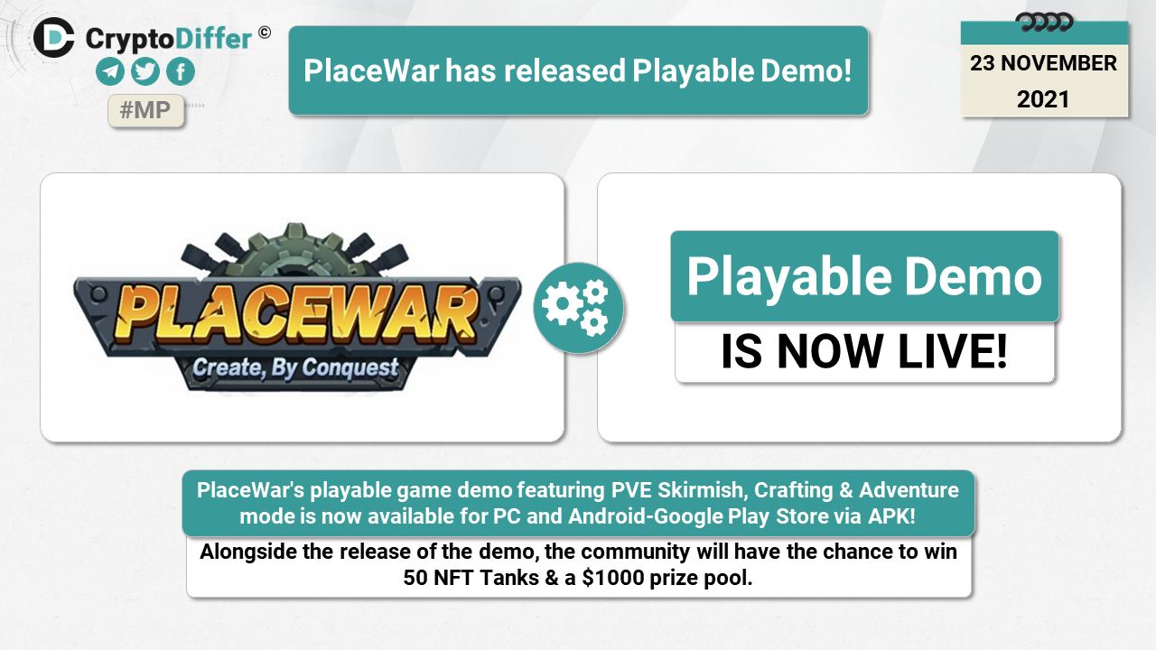PlaceWar's playable game demo featuring PVE Skirmish, Crafting & Adventure mode is now available for PC and Android-Google Play Store via APK along with rewarding users 50 genesis NFT tanks with a $1000 prize pool giveaway.