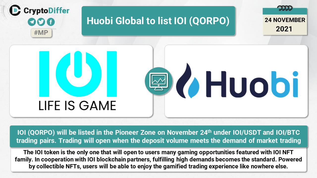 IOI (QORPO) will be listed in the Pioneer Zone on November 24th under IOI/USDT and IOI/BTC trading pairs. Trading will open when the deposit volume meets the demand of market trading.
