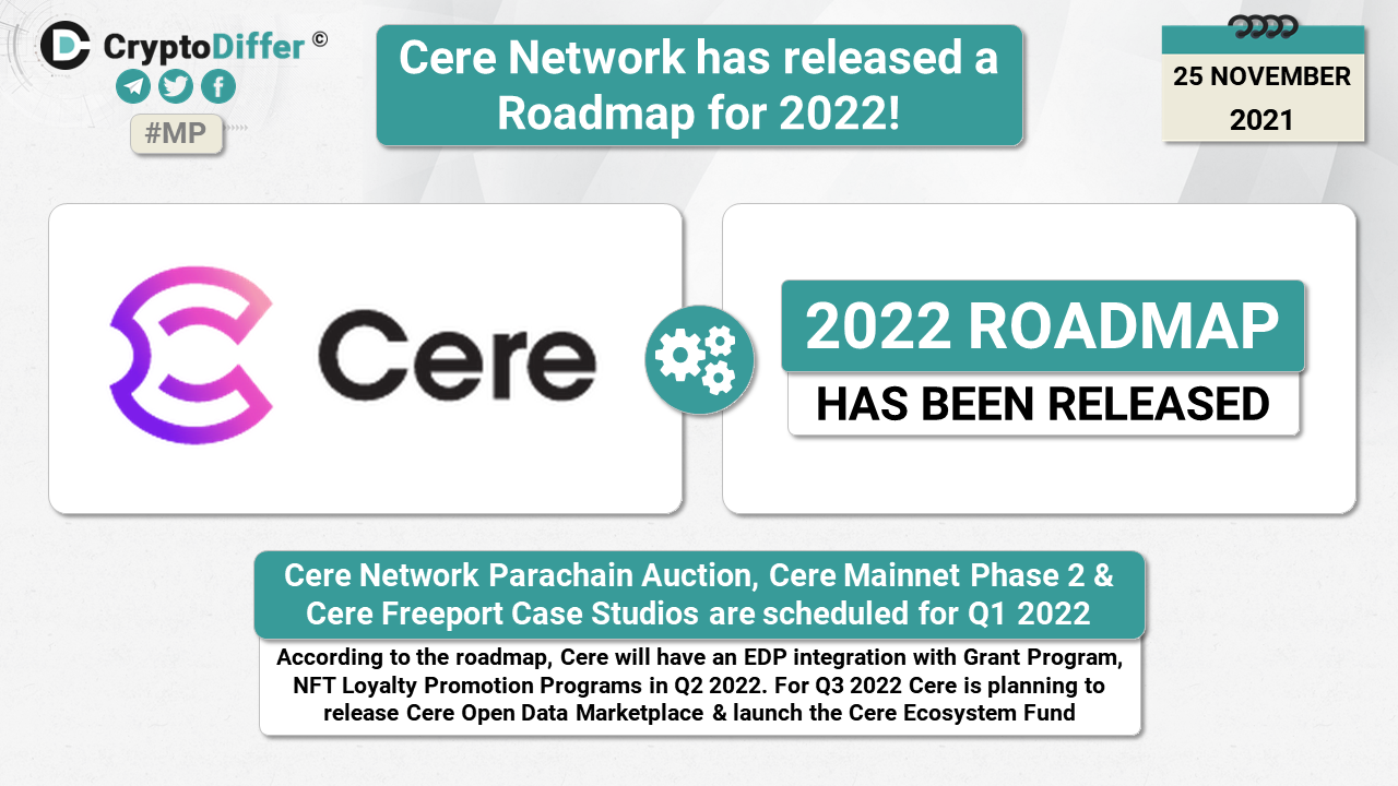 Cere Network Parachain Auction, Cere Mainnet Phase 2 & Cere Freeport Case Studios are scheduled for Q1 2022.