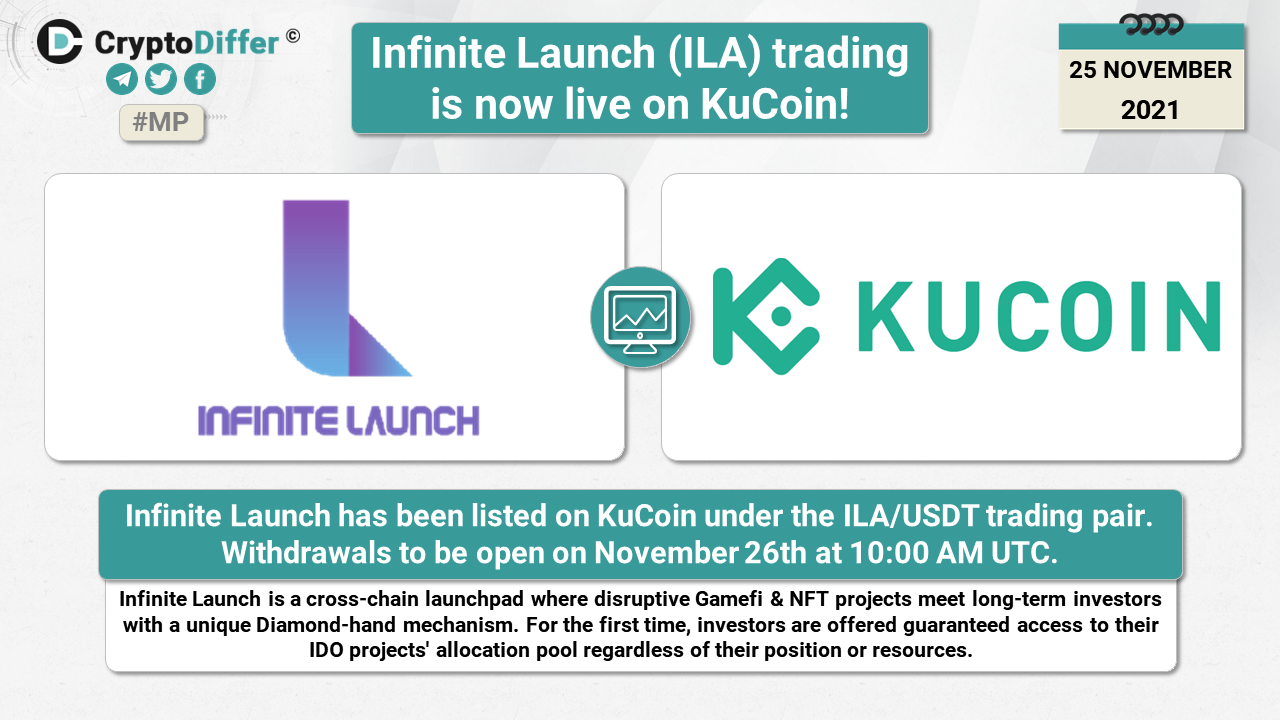 Infinite Launch has been listed on KuCoin under the ILA/USDT trading pair. Withdrawals to be open on November 26th at 10:00 AM UTC.