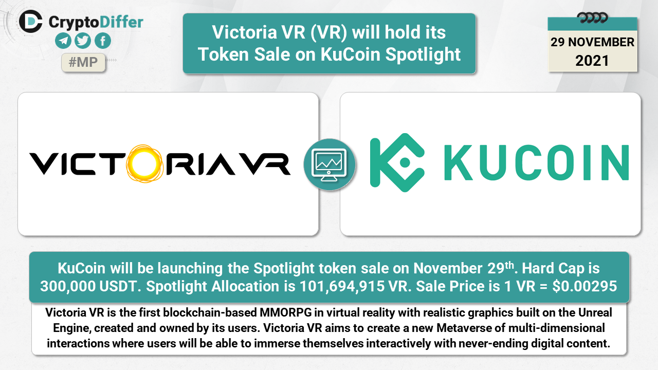 KuCoin will be launching the Spotlight token sale on November 29th. Hard Cap is 300,000 USDT. Spotlight Allocation is 101,694,915 VR. Sale Price is 1 VR = $0.00295.