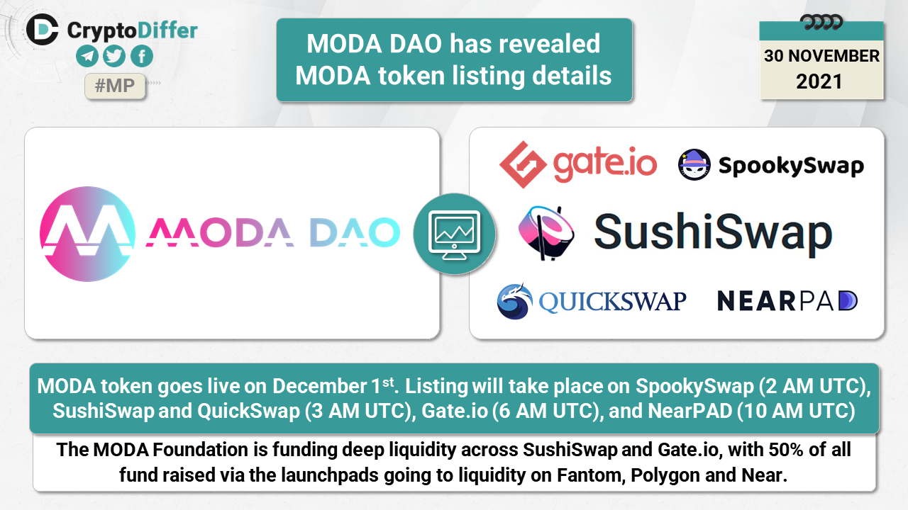 MODA token goes live on December 1st. Listing will take place on SpookySwap (2 AM UTC), SushiSwap and QuickSwap (3 AM UTC), Gate (6 AM UTC), and NearPAD (10 AM UTC).