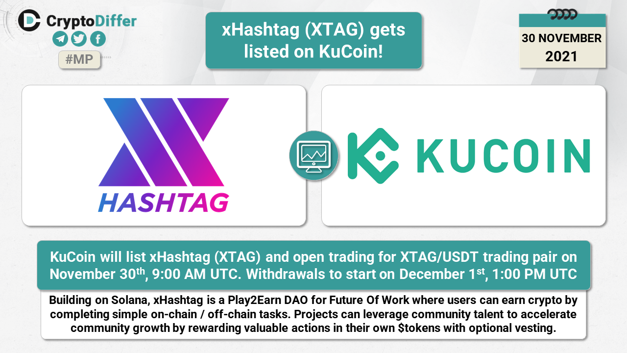 KuCoin will list xHashtag (XTAG) and open trading for XTAG/USDT trading pair on November 30th, 9:00 AM UTC. Withdrawals to start on December 1st, 1:00 PM UTC.