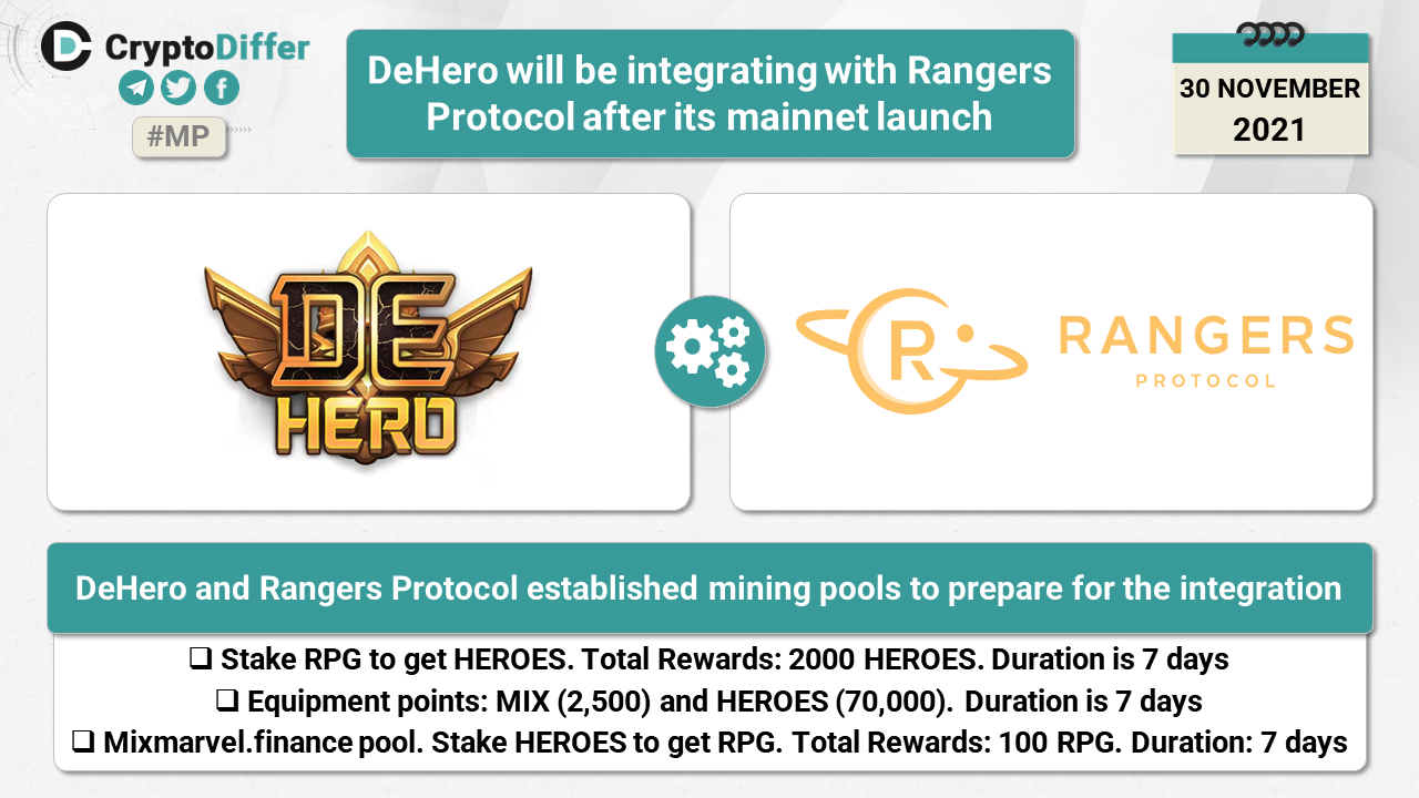 DeHero and Rangers Protocol established mining pools to prepare for the integration: Stake RPG to get HEROES, Equipment points, and Mixmarvel finance pool.