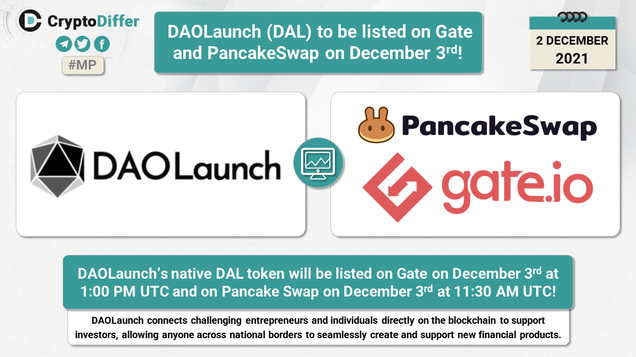 DAOLaunchβs native DAL token will be listed on Gate on December 3rd at 1:00 PM UTC and on Pancake Swap on December 3rd at 11:30 AM UTC.