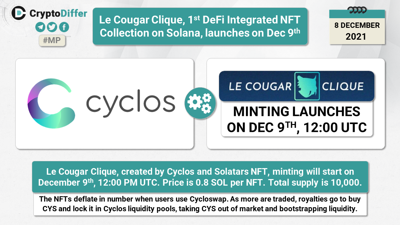 Le Cougar Clique, created by Cyclos and Solatars NFT, minting will start on December 9th, 12:00 PM UTC. Price is 0.8 SOL per NFT. Total supply is 10,000. Mint link to be shared on Cyclos Discord and Twitter at 12:00 PM UTC