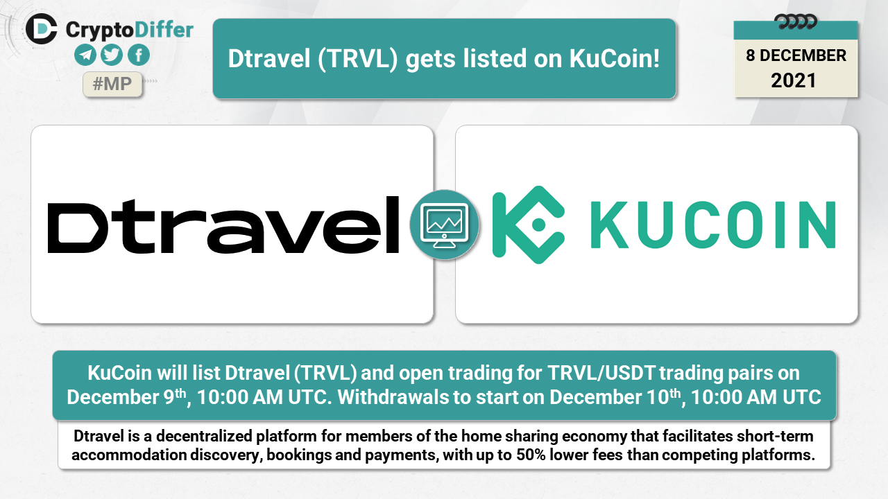 KuCoin will list Dtravel (TRVL) and open trading for TRVL/USDT trading pairs on December 9th, 10:00 AM UTC. Withdrawals to start on December 10th, 10:00 AM UTC