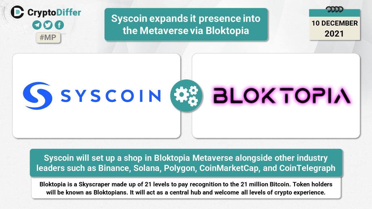 Syscoin will set up a shop in Bloktopia Metaverse alongside other industry leaders such as Binance, Solana, Polygon, CoinMarketCap, and CoinTelegraph.