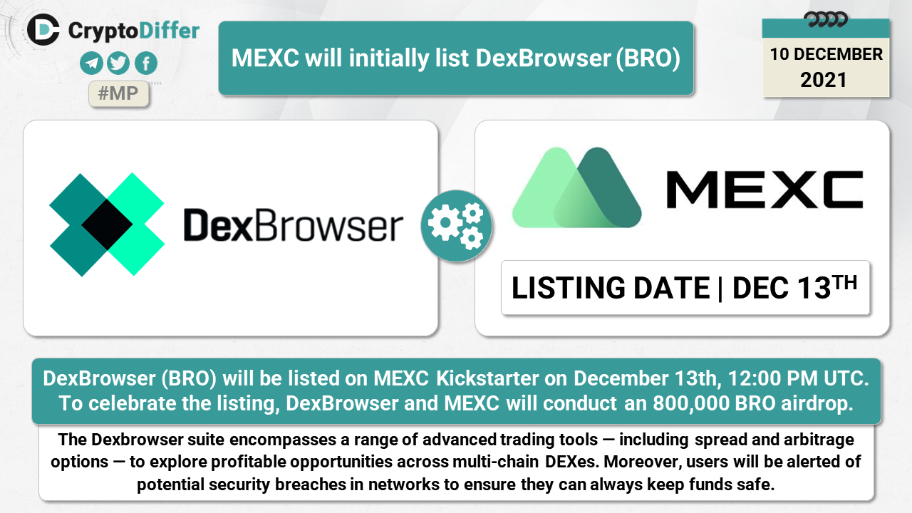 DexBrowser (BRO) will be listed on MEXC Kickstarter on December 13th, 12:00 PM UTC. To celebrate the listing, DexBrowser and MEXC will conduct an 800,000 BRO airdrop.