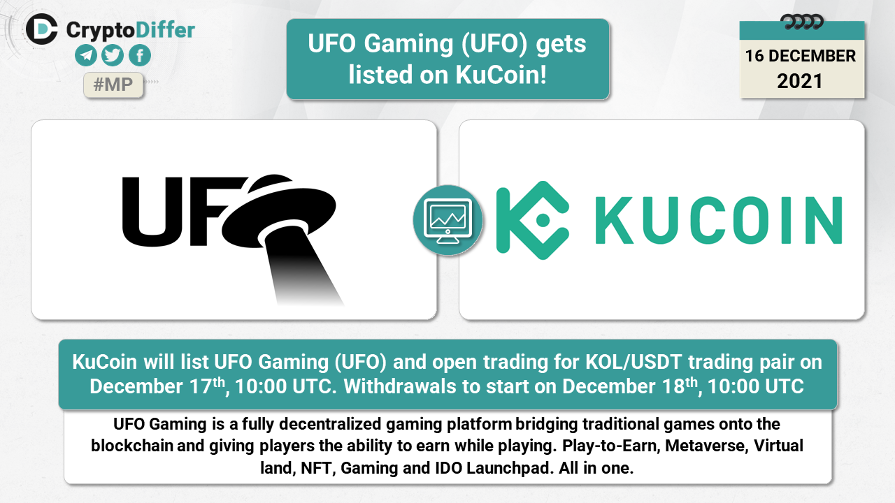 KuCoin will list UFO Gaming (UFO) and open trading for KOL/USDT trading pair on December 17th, 10:00 UTC. Withdrawals to start on December 18th, 10:00 UTC.