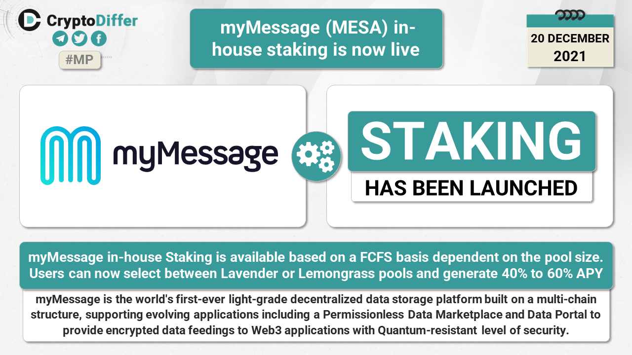 myMessage in-house Staking is available based on a FCFS basis dependent on the pool size. Users can now select between Lavender or Lemongrass pools and generate 40% to 60% APY.