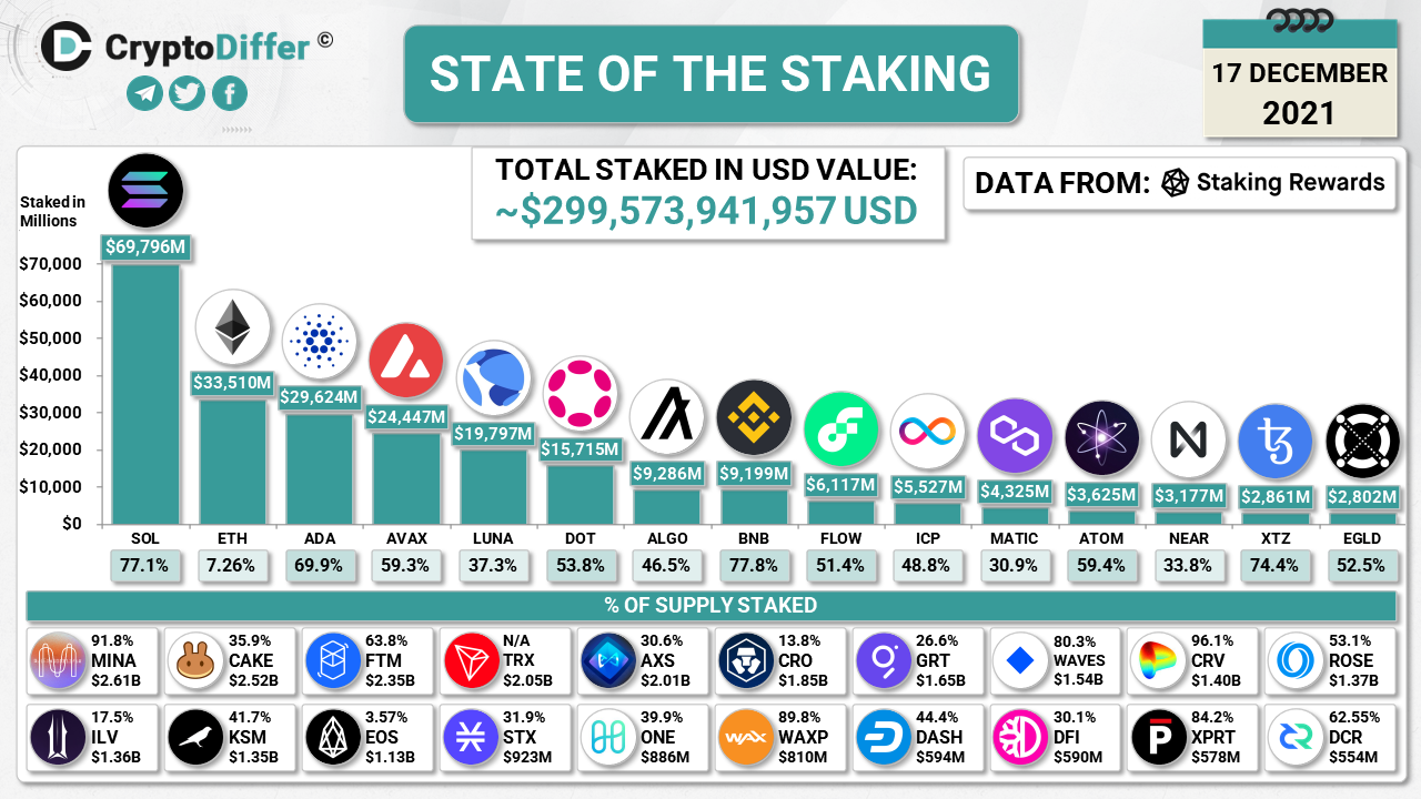 We have prepared the list of projects sorted by the USD value of the staked tokens. According to the list, top 5: Solana, Ethereum, Cardano, Avalanche, and Terra.