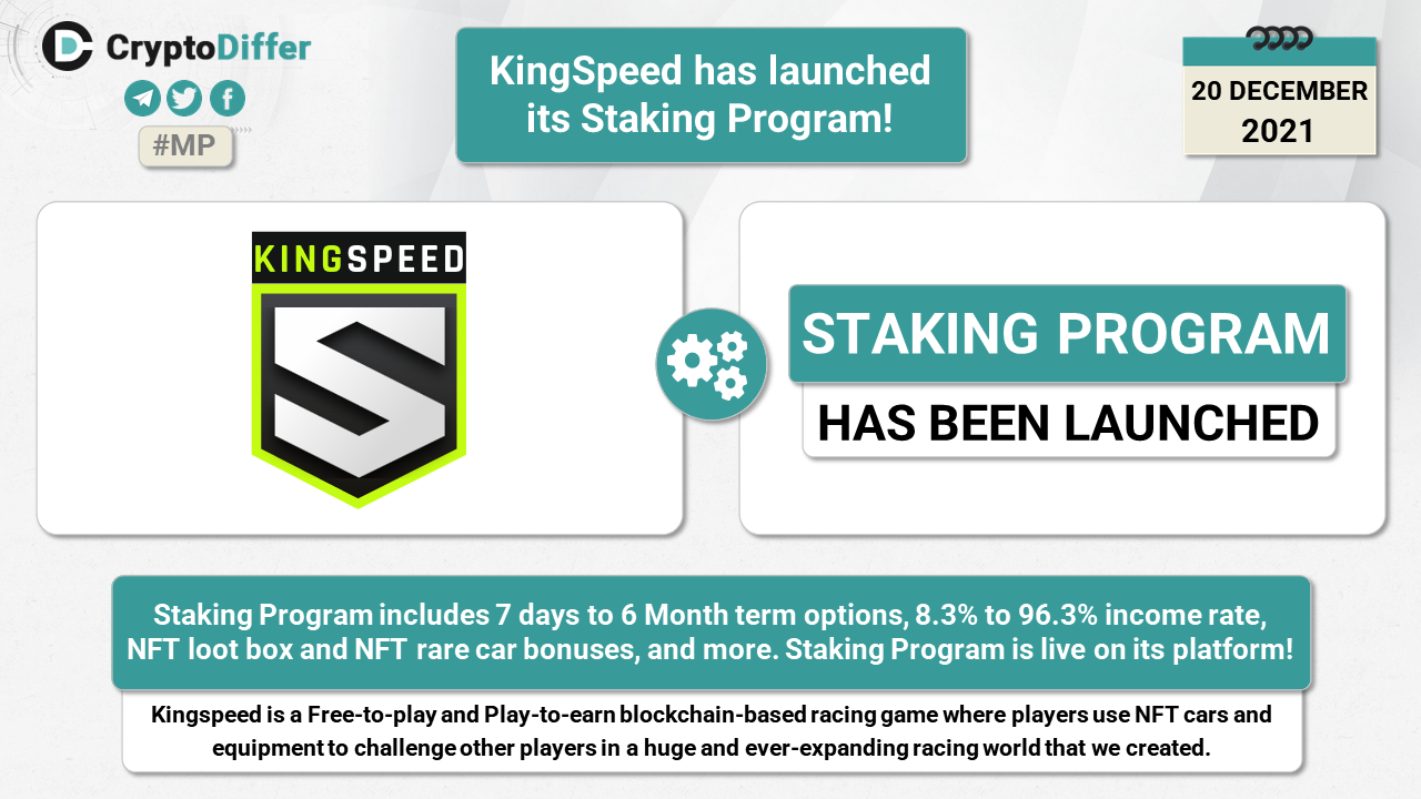 Staking Program includes 7 days to 6 Month term options, 8.3% to 96.3% income rate, NFT loot box and NFT rare car bonuses, and more. Staking Program is live on its platform.